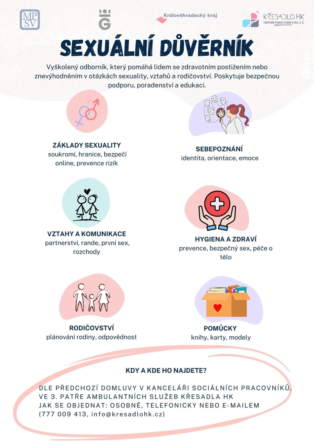 Sexuální důvěrník je označení pro pracovní pozici odborníka nejenom v sociálních službách, který se v rámci své náplně práce zabývá tématem sexuality, vztahů a rodičovství lidí se zdravotním postižením či sociálním znevýhodněním. V rámci své činnosti realizuje sexuální výchovou, poradenství, osvětu či se zaměřuje na oblasti zákonných a společenských norem a na odpovědnost a možná rizika. Sexuální důvěrník předává klientům/uživatelům služby obecně platné informace s ohledem na jejich diagnózu, komunikaci, věk, genderovou identitu, životní fázi či sociální prostředí. Sexuální důvěrník je proškolená osoba, kterou Křesadlo HK pověřilo k výkonu této pozice.